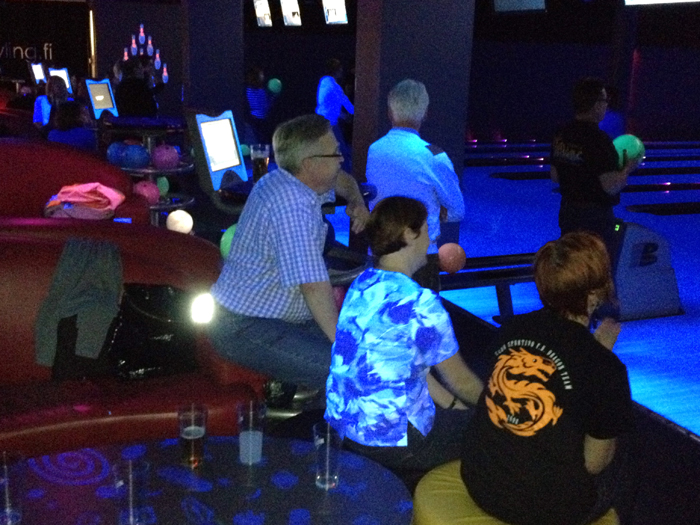 Iloinen joukkomme tapasi toisensa Ruusulankadun keilahallissa hohtokeilauksen merkeissä kauniina keväisenä tiistai-iltana 17.3. Mukaan oli lähtenyt neljätoista keilaajaa ja saimme mukavasti täytettyä neljä rataa. Keilahalli tarjosi jalkineet ja viereinen baari oli oikein hyvin varustettu mm. Fernet Brancalla. Radat olivat varattu aiemmista kokemuksista viisastuneina nyt kahdeksi tunniksi, jolloin jokaisella radalla ehdittiin heittää kolme täyttä kierrosta. Kisa oli tiukkaa, vaikkakaan ei kovin vakavaa. Kisan puolivälissä oli kolme pelaajaa jakamassa kärkipaikkaa tasatuloksilla. Pelaajat olivat Risto Hämälainen, Pekka Palsanen ja Raimo Moliis. Lopullisen pesäeron teki kuitenkin Rauno Moliis, heittämällä hyvän tuloksen 170 pistettä ja viemällä voiton. Naistensarjan voittoon heitti Hanna Mansnerus, joka tuloksellaan 146 olisi voittanut suuren osan miespelaajista.