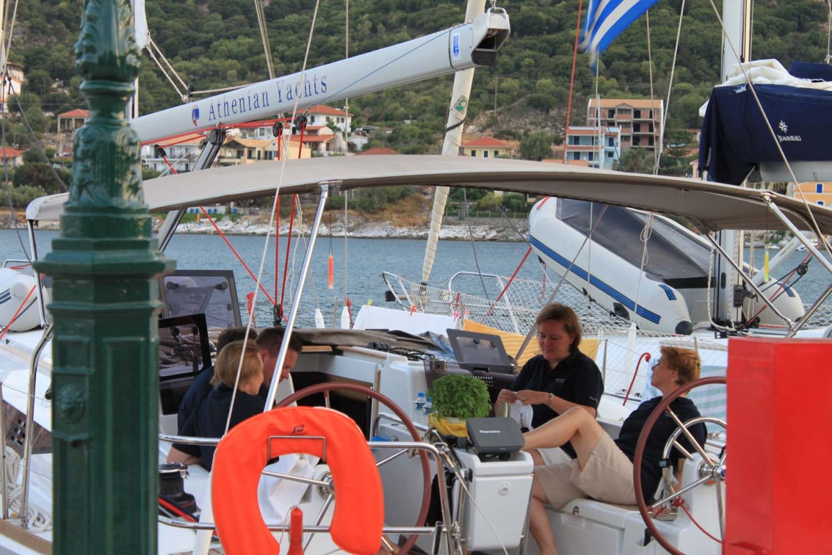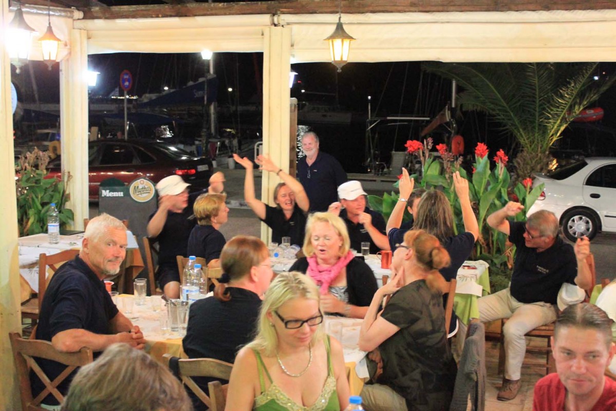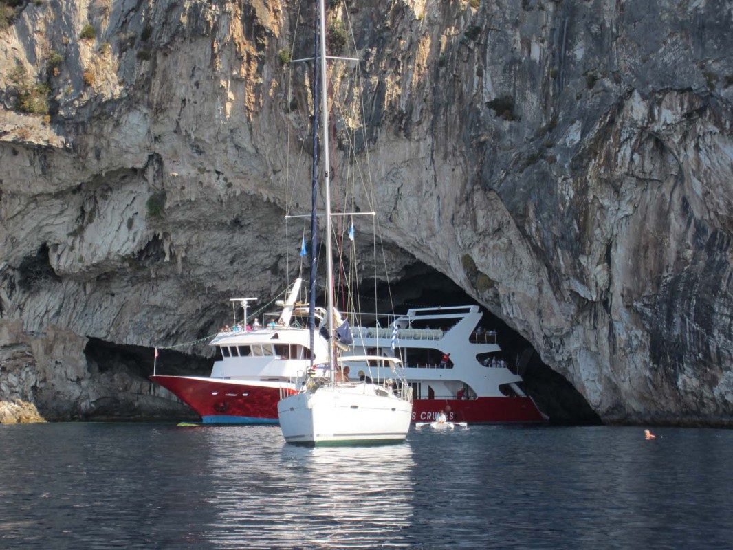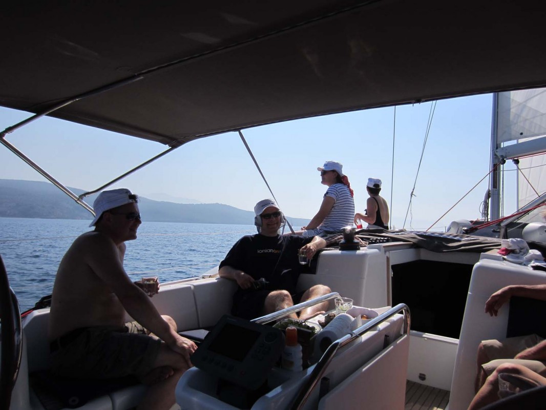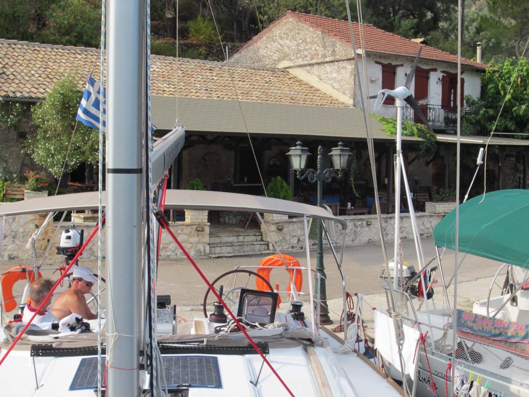 Aamulla oli tyyntä ja lämmintä. Ohjelmassa oli Meganisin saaren luoliin tutustumista. Retkikuntamme löysi luolasta melanomavapaan hiekkarannan. Luonan seinästä löytyi myös graffitteja, ilmeisesti desanttien tekemiä. Puolenpäivän aikoihin rupesi taas tuulemaan ja purjehdimme lounastamaan ja uimaan One House Bay nimiseen lahdelmaan. Oli kiva snorklailla kun kalparvet pyörivät veneen ympärillä. Osa kaloista oli niin kesyjä, että niitä sai kiinni paljain käsin. Illaksi purjehdimme Ithakalle Vathiin. Tämä olikin jo isompi kylä jossa oli lukuisia pieniä kauppoja ja paljon ravintoloita. Oli satamaan parkkeerattu pari superjahtiakin. Yöllä satamaan saapui paikallinen yhteyslaiva joka aiheutti melkoiset aallot, niin että koko satama heräsi tarkistamaan, että vieläkö ankkuri pitää. Aamulla kalastajat tulivat myymään saaliitaan rantaan. Kävimme kokeilemassa myös kirkonkellojen sointia. Puolen päivän jälkeen matkasimme Kefaloniaan Eufimia-kylään jossa on kuvattu elokuva Kaapteeni Corellin mandoliini. Siitä asiasta nyt ei paljoa ollut jäljellä - yksi kahvila. Ilta meni vauhdikkaasti kun kreikkalaiset ja suomalaiset muusikot yhdistivät voimansa. Meno oli vauhdikasta ja erittäin hauskaa. Ilta loppui vasta aikaisn aamulla ja ravintoloitsija oli erittäin tyytyväinen.