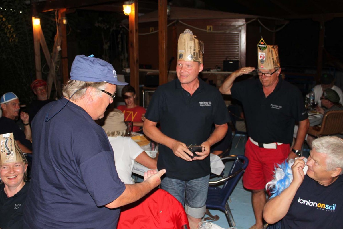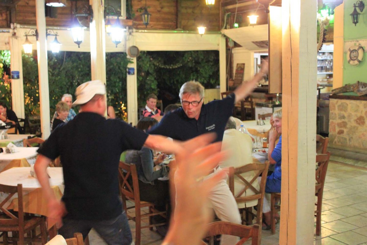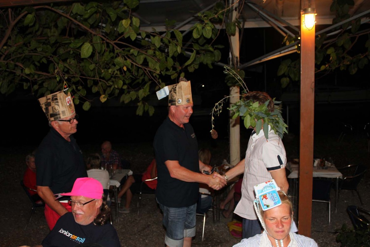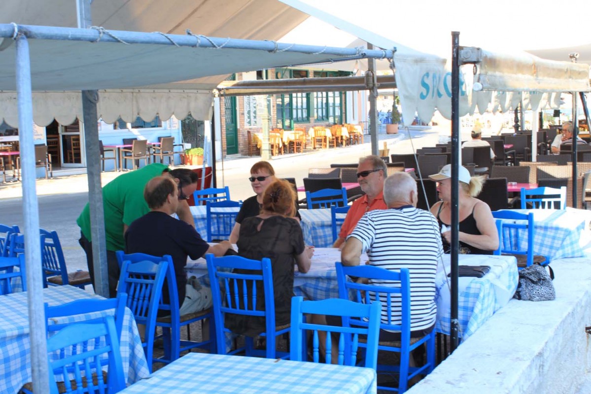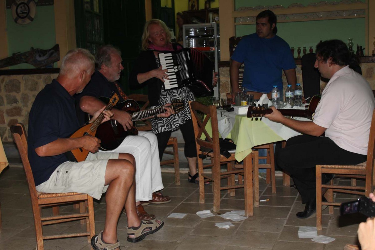 Aamulla oli tyyntä ja lämmintä. Ohjelmassa oli Meganisin saaren luoliin tutustumista. Retkikuntamme löysi luolasta melanomavapaan hiekkarannan. Luonan seinästä löytyi myös graffitteja, ilmeisesti desanttien tekemiä. Puolenpäivän aikoihin rupesi taas tuulemaan ja purjehdimme lounastamaan ja uimaan One House Bay nimiseen lahdelmaan. Oli kiva snorklailla kun kalparvet pyörivät veneen ympärillä. Osa kaloista oli niin kesyjä, että niitä sai kiinni paljain käsin. Illaksi purjehdimme Ithakalle Vathiin. Tämä olikin jo isompi kylä jossa oli lukuisia pieniä kauppoja ja paljon ravintoloita. Oli satamaan parkkeerattu pari superjahtiakin. Yöllä satamaan saapui paikallinen yhteyslaiva joka aiheutti melkoiset aallot, niin että koko satama heräsi tarkistamaan, että vieläkö ankkuri pitää. Aamulla kalastajat tulivat myymään saaliitaan rantaan. Kävimme kokeilemassa myös kirkonkellojen sointia. Puolen päivän jälkeen matkasimme Kefaloniaan Eufimia-kylään jossa on kuvattu elokuva Kaapteeni Corellin mandoliini. Siitä asiasta nyt ei paljoa ollut jäljellä - yksi kahvila. Ilta meni vauhdikkaasti kun kreikkalaiset ja suomalaiset muusikot yhdistivät voimansa. Meno oli vauhdikasta ja erittäin hauskaa. Ilta loppui vasta aikaisn aamulla ja ravintoloitsija oli erittäin tyytyväinen.