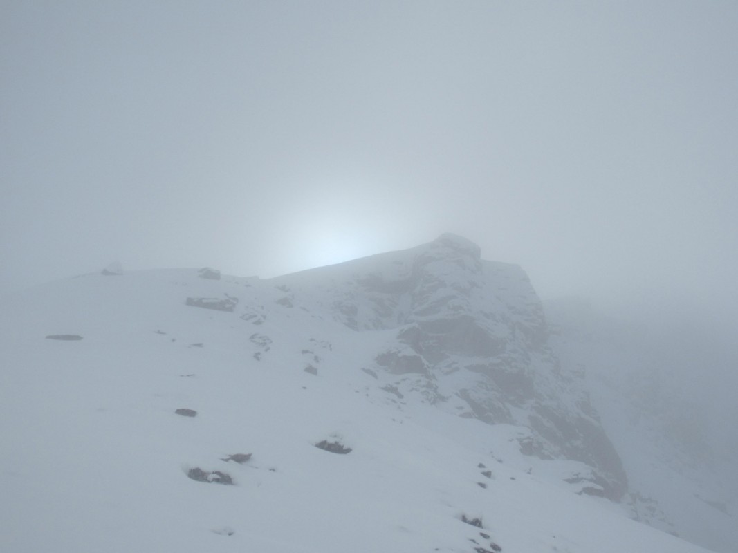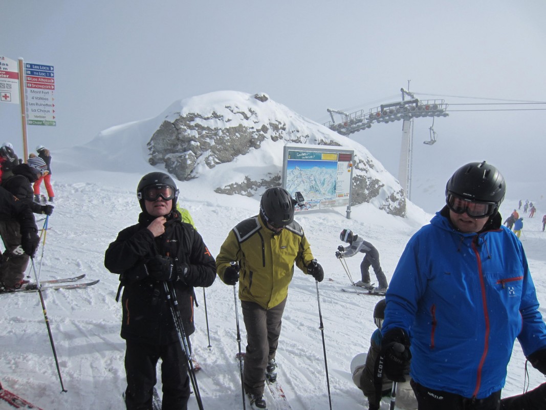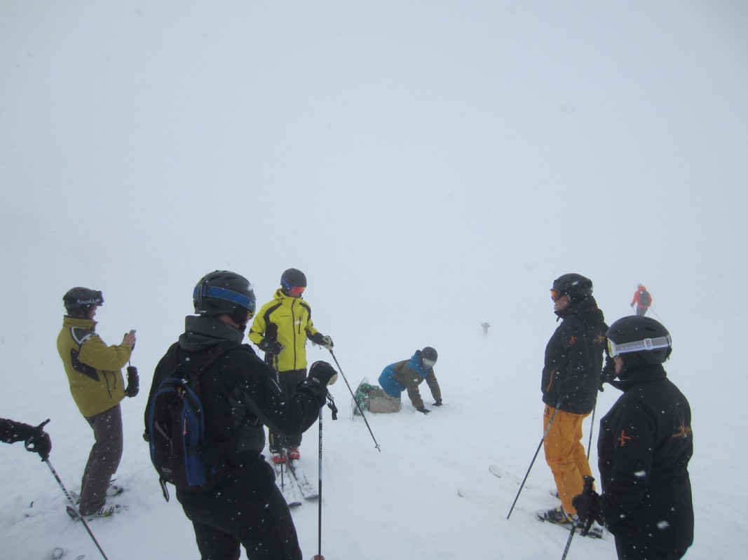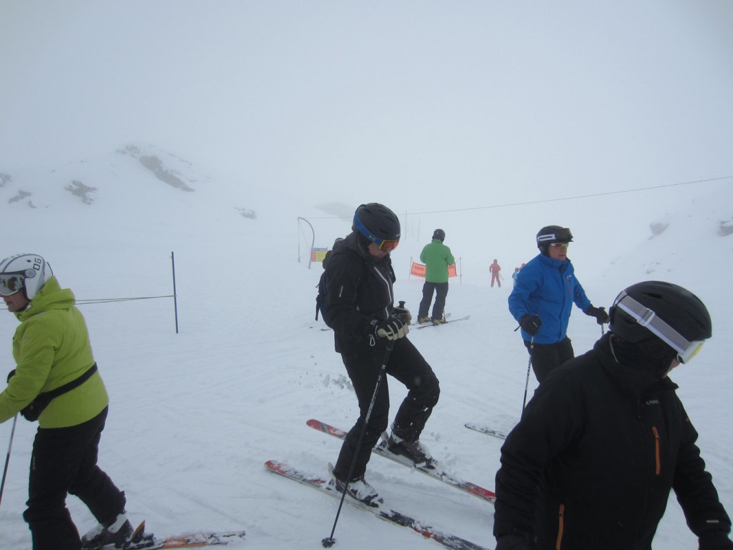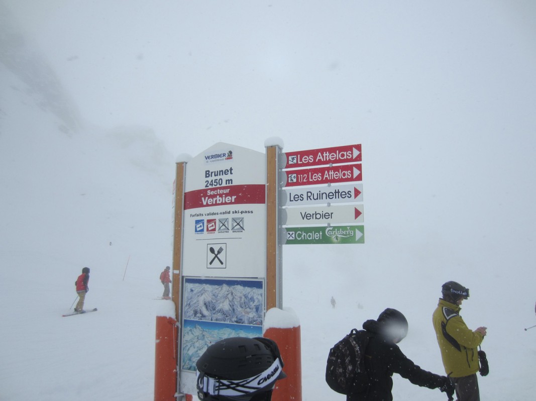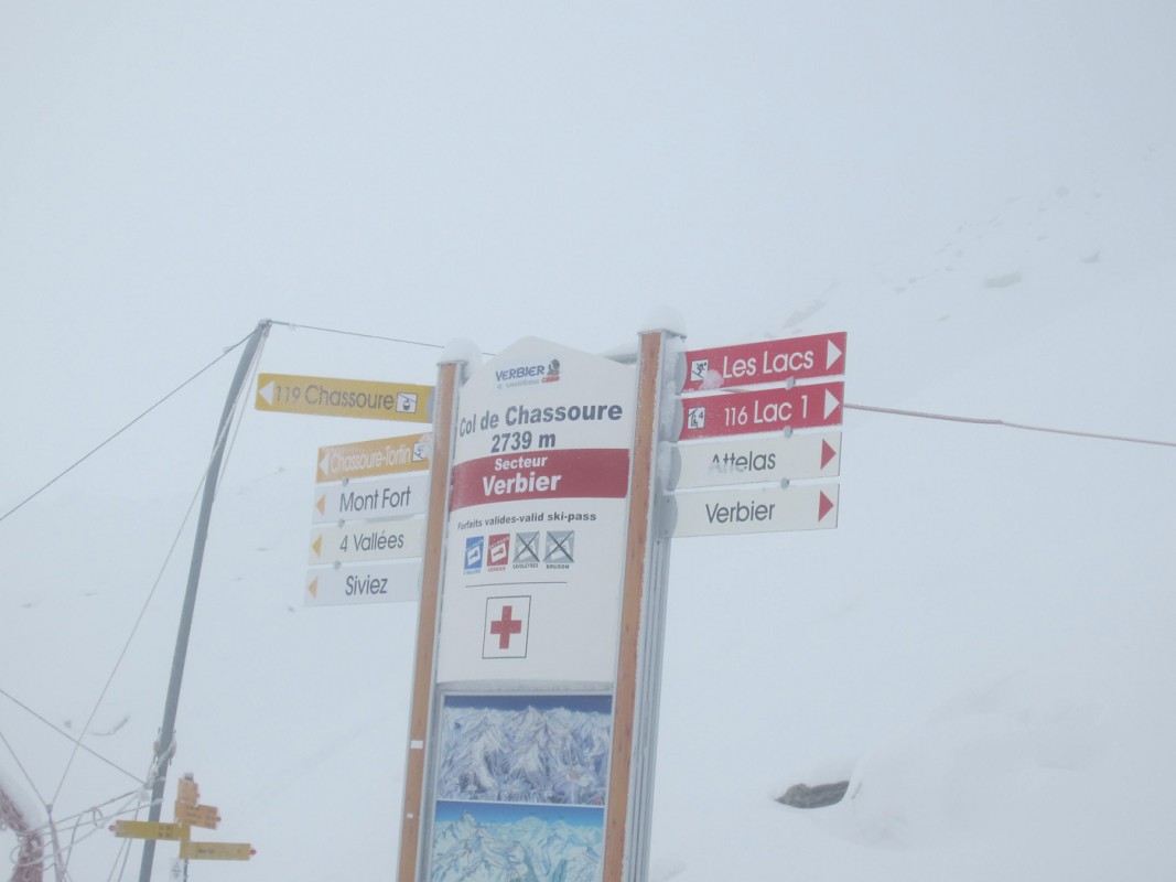 Sunnuntai aukeni sumuisena ja hieman lumisateisena. Nousimme kuitenkin Les Ruinettesin yläasemalle, josta opas ohjasi meitä ylöspäin seuraavaan hissiin. Laskimme huonossa ja todella huonossa näkyväisyydessä. Aivan ylhäällä Col des Gentianesissa (2950 m) paistoi ajoittain aurinko. Huonosta näkyvyydestä johtuen laskimme turvallisesti sinistä rataa (känniränniä) pitkin hotellille.