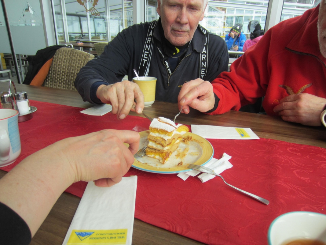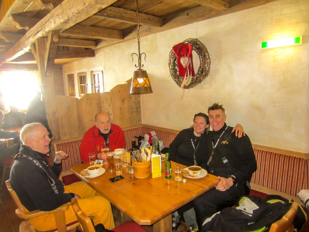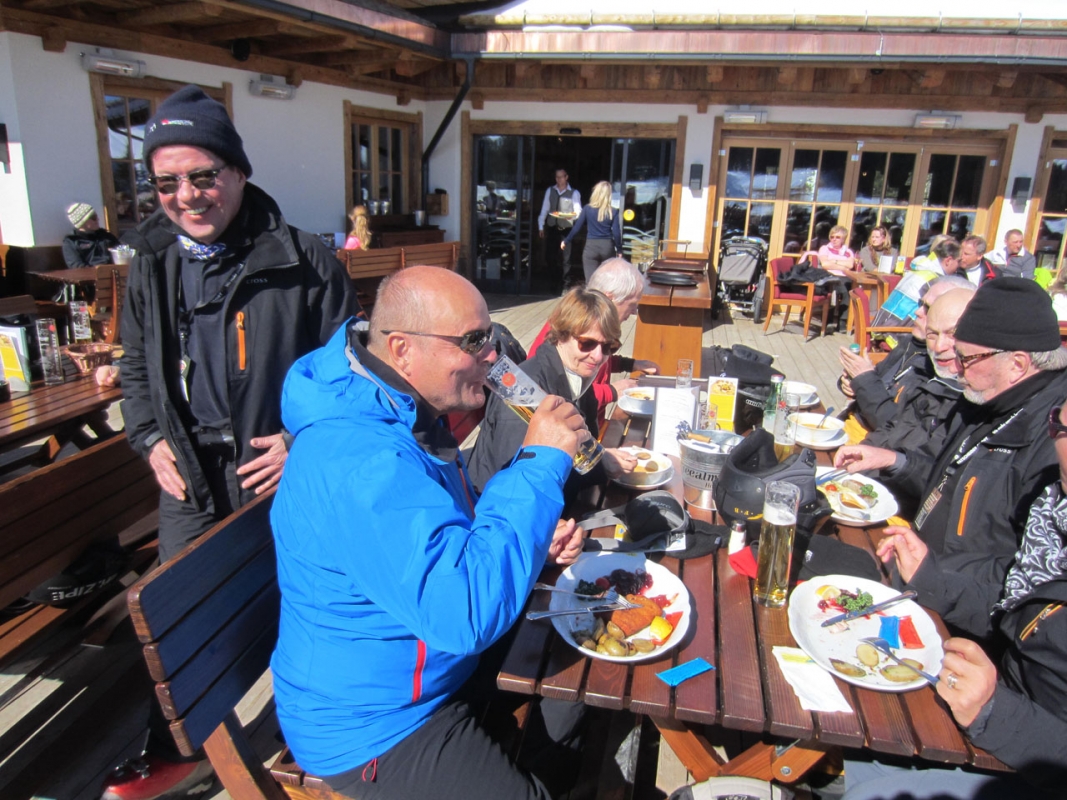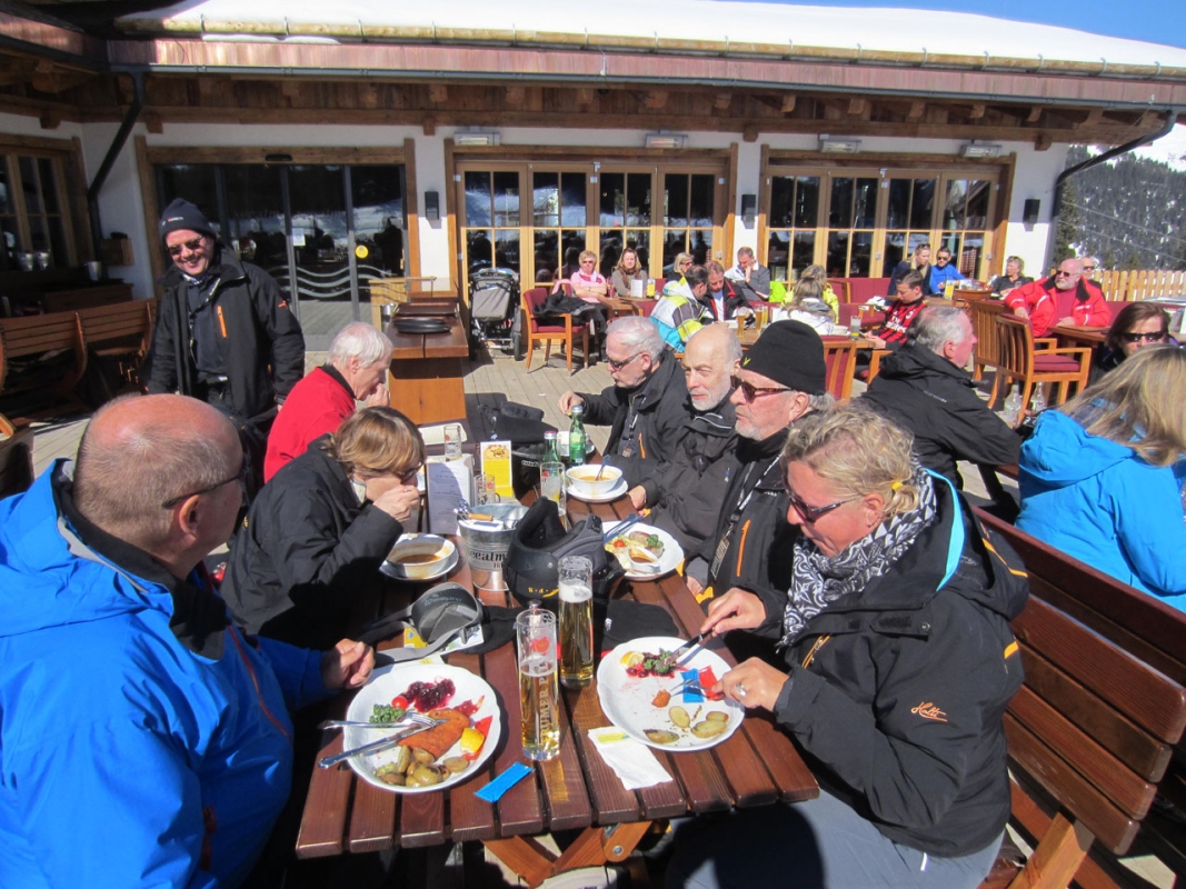 Maittavat lounaat nautittiin terassilla tai tuulisemmalla rinteellä sisätiloissa. Alueen rinneravintoloissa saattoi valita itsepalvelun ja pöytiintarjoilun väliltä. Viimemainittukin toimi yleensä ripeästi muuten paitsi maksamisen osalta. Päivät kruunasi puolihoitoon sisältyvä neljän ruokalajin illallinen pöytiin tarjoiltuna hotellien lähellä sijaitsevassa ravintolassa, joka tasoltaan oli yleisesti vallinneen konsensuksen mukaan erinomainen ja linjakas. Itävaltalaiset viinit ja oluetkin olivat ehdottomasti hintansa arvoisia.