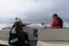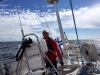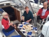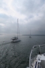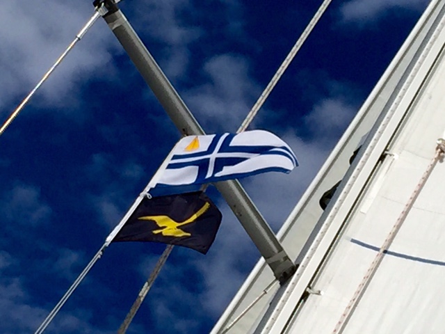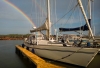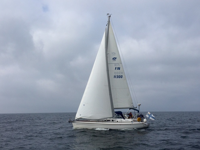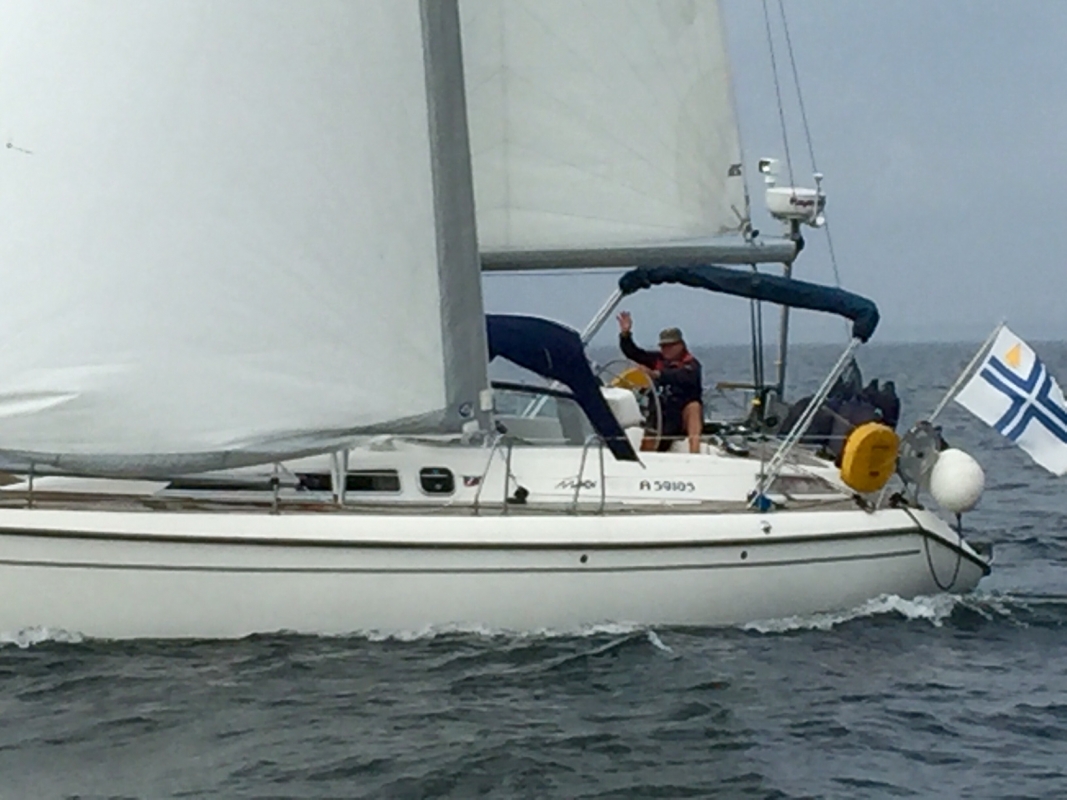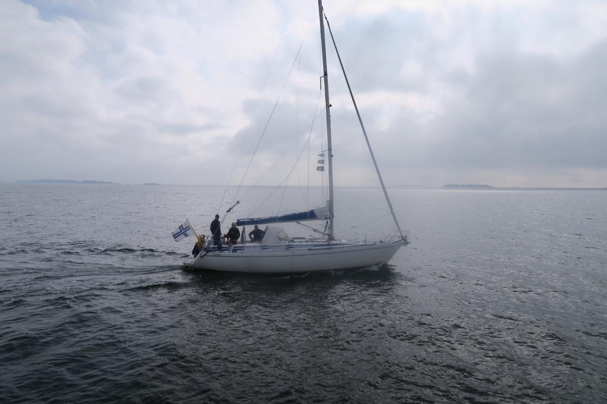Paluupäivän aamulla satama näytti harmaalta, mutta merellä vallitsi mainio purjehdussää. Purjeet nostettiin heti aallonmurtajan ulkopuolella, ja reipas lounaanpuoleinen tuuli kiidätti eskaaderin purjein kulkevat alukset lähes ennätysajoissa takaisin Suomen puolelle. Rannikon yllä kummittelevista sadepilvistä tipahti vielä rantautuessa sen verran vettä, että hieno sateenkaari saatiin veneen kanssa samaan kuvaan.