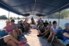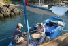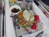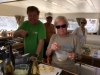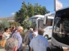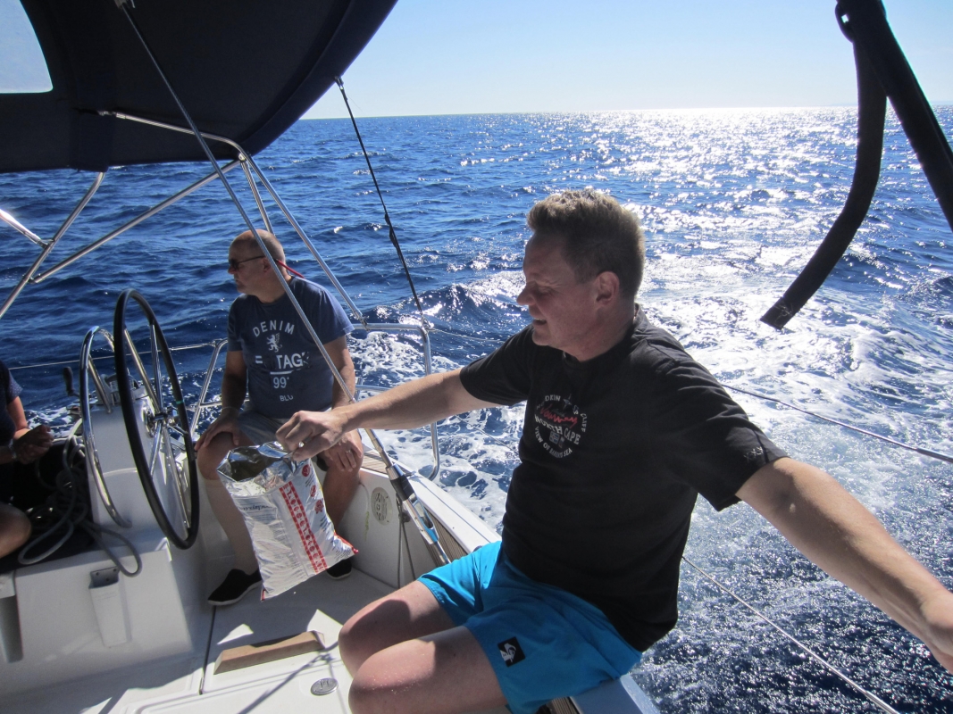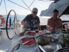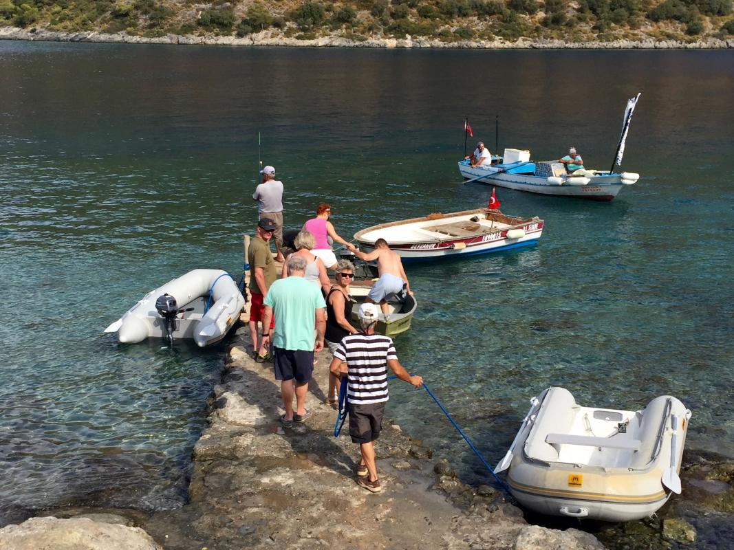 Aamu toi hotelliaamiaisen jälkeen taas bussin, jonka ensimmäinen pysäkki oli Migros-supermarket, jossa tehdyt provianttihankinnat pakattiin laatikoihin, merkittiin venekohtaisesti ja lastattiin aamupäivän helteessä kahteen tilataksiin, jotka ajoivat bussimme kanssa karavaanina vajaan tunnin matkan vuoriston halki Hisarönün lahdelle. Vesipullopaketit ja pahvilaatikot huokailivat serpentiinimutkissa 7% rinteissä; taksikuski jutusteli saksaksi, mutta tarvittaessa kiroili painokkaasti selvällä suomen kielellä.