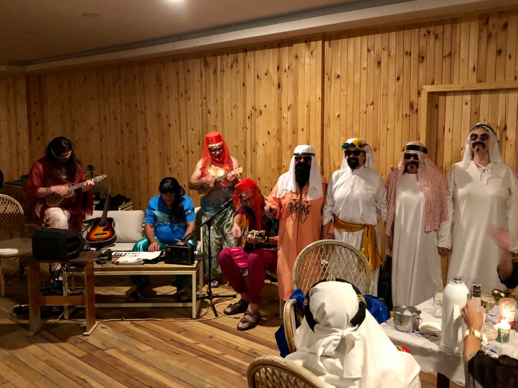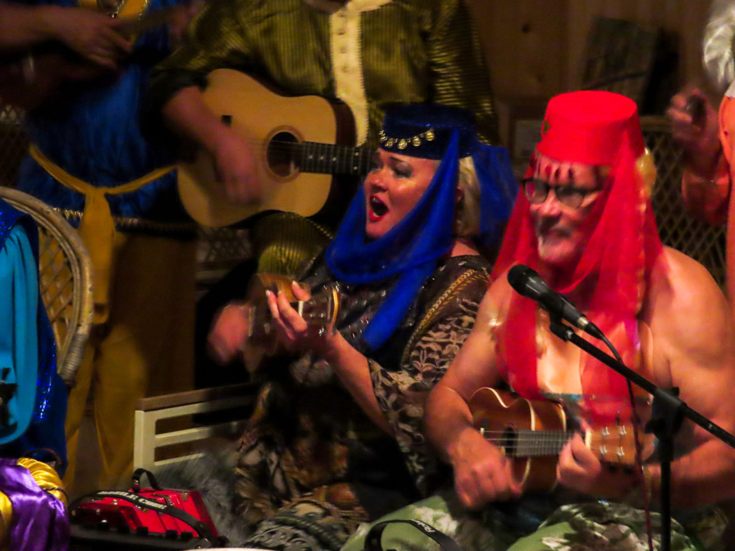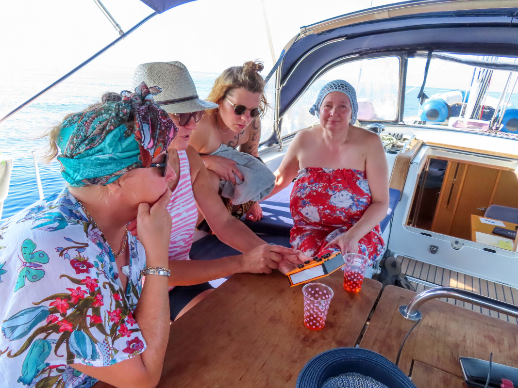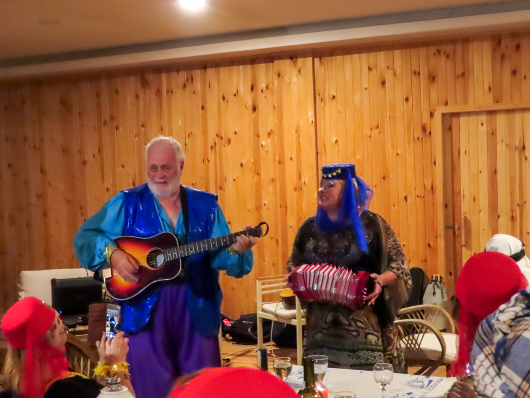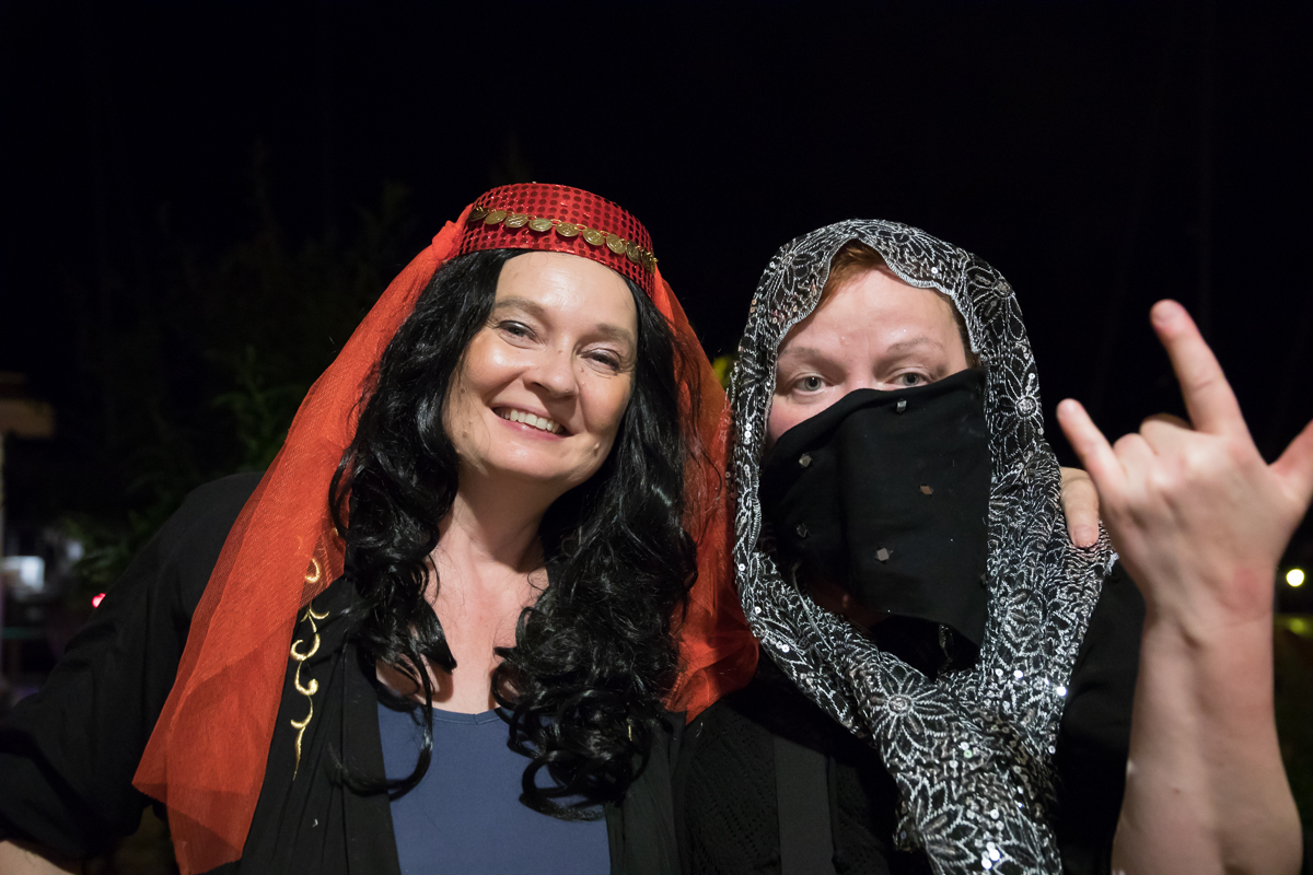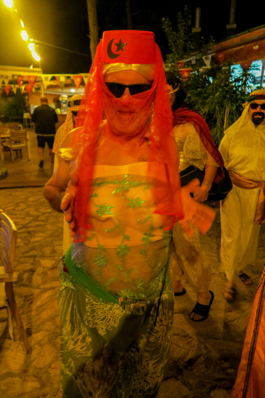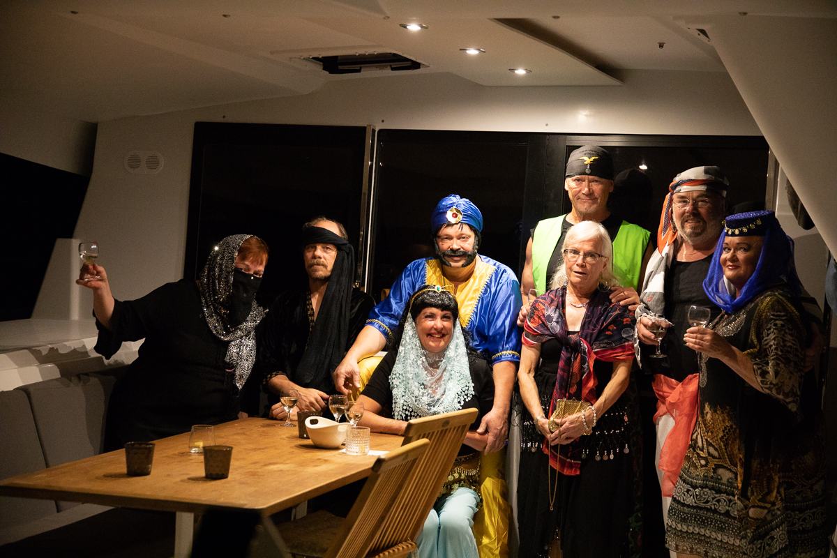 Sarsalassa paikan isäntä Cesco oli varannut veneillemme laituripaikat sekä koristellut sataman ja juhlasalin värivaloin. Ohjelmassa oli aluksi perinteinen Marken aperitiivipornobingo ja sen jälkeen gaalailta, johon kokoonnuttiin sonnustautuneina tuhannen ja yhden yön satujen innoittamiin asuihin. Illallisen jälkeen 'teko oli vapaa’; erilaisia venekuntien omia tai yhteisiä poikkitaiteellisia ja musiikillisia pläjäyksiä nähtiin useita. Tunnelma tilaisuudessa ja koko satamassa oli mieliinpainuva, eikä sitä tarvinnut pilata laskuja maksamalla - ne hoidettiin aamiaisen yhteydessä, samalla kun tilattiin vielä lounassalaatti ja tuoreet leivät mukaan perjantaipäivän lounaaksi.