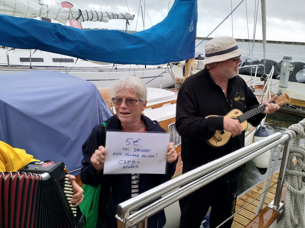Laiturille palattuamme Tallinnan "Tiernapojat" (ja -tytöt) kiersi veneitä ukulelet ja hattu kädessä. Tippiä heltisikin peräti 62 euroa, joka tositetusti tilitettiin John Nurmisen säätiölle Itämeren suojelun hyväksi.