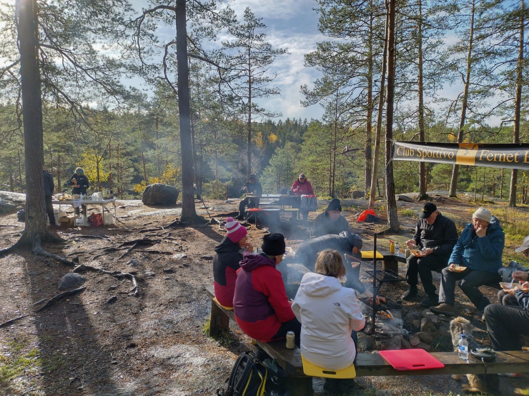 Nuotiopaikalla Jarmo oli sytyttänyt makkaratulet, ja jossakin vaiheessa savun alta alkoi näkymään liekkejä ja hiillosta. Lenkin jälkeinen alkulämmittely suoritettiin Fernetin voimin, ja sen jälkeen oli Terhin ohjaaman venyttelytuokion aika. Kun luut ja nivelet olivat aikansa rutisseet, oli aika nauttia grillimakkarat lisukkeineen.