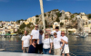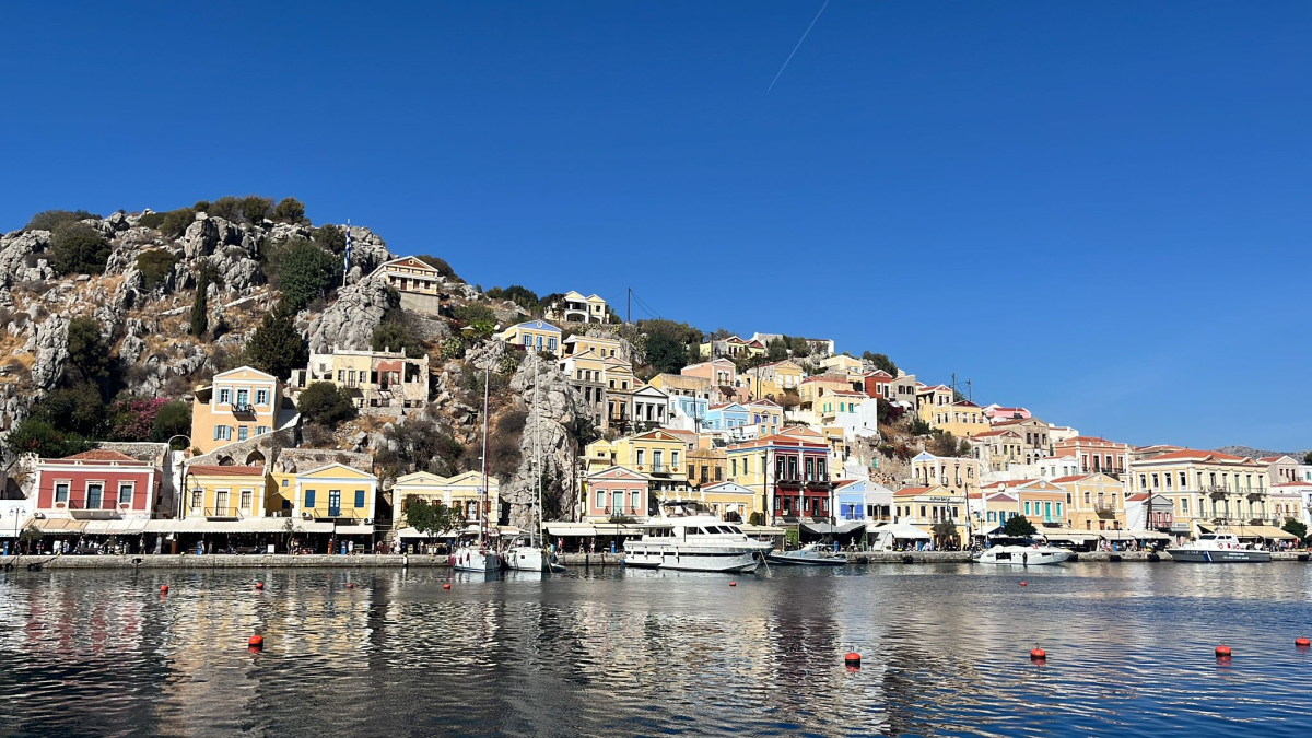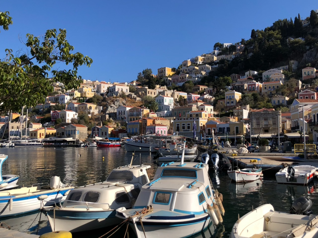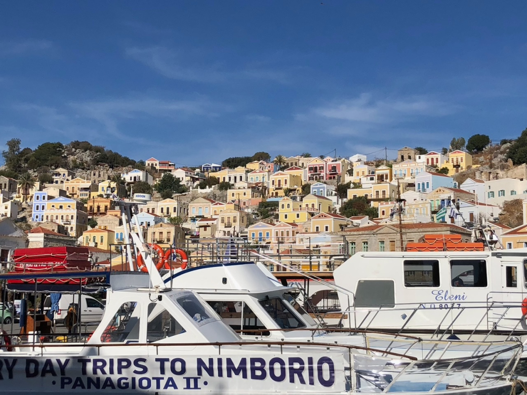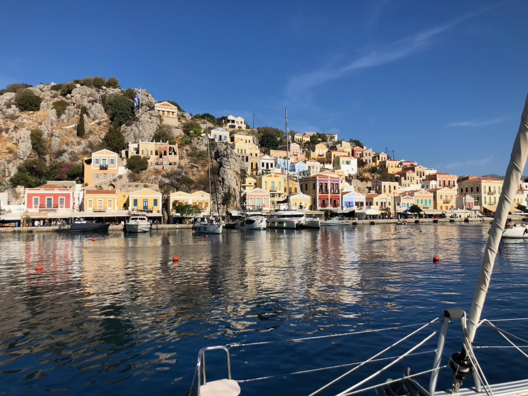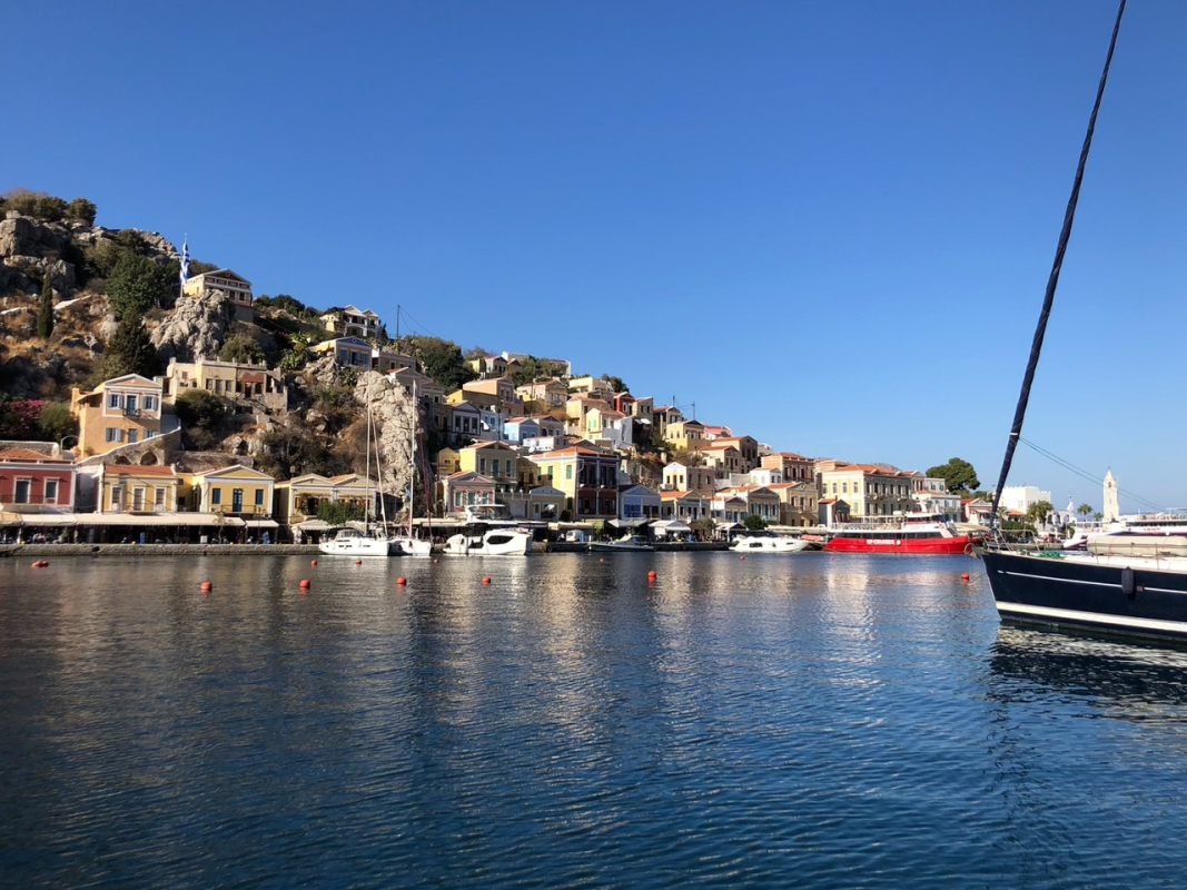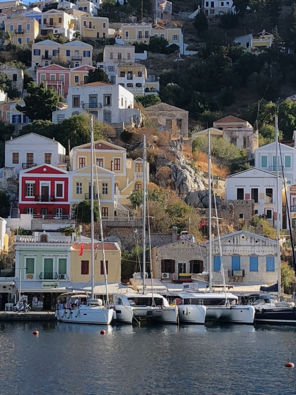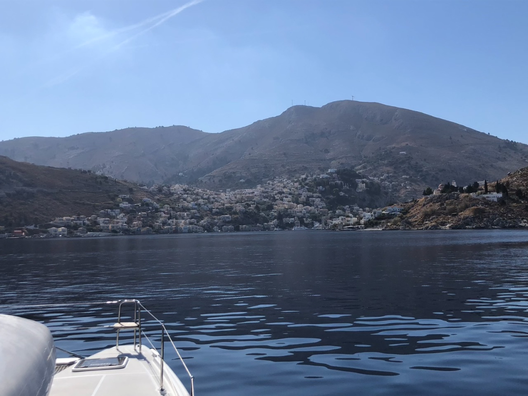 Torstain kurssijuhlaa varten suunnattiin Symin kaupunkiin. Symin maisemat ovat useammankin kerran nähtynä ainutlaatuinen elämys, ja sää suosi retkikuntaamme. Veneet kiinnitettiin ankkurin tai mooring-köysien sijaan keulastaan poijuihin, joita oli asennettu molemmin puolin lahtea. Tilaa oli illallakin hyvin, vaikka muut satamat olivat olleet täysiä. Uimapaikka löytyi lahden pohjoisrannalta hotellin takaa, ja virkeimmät kiipesivät aamupäivällä arkeologiseen museoon, joka olikin yllättäen aika korkealla kaupungin yläpuolella.