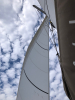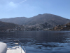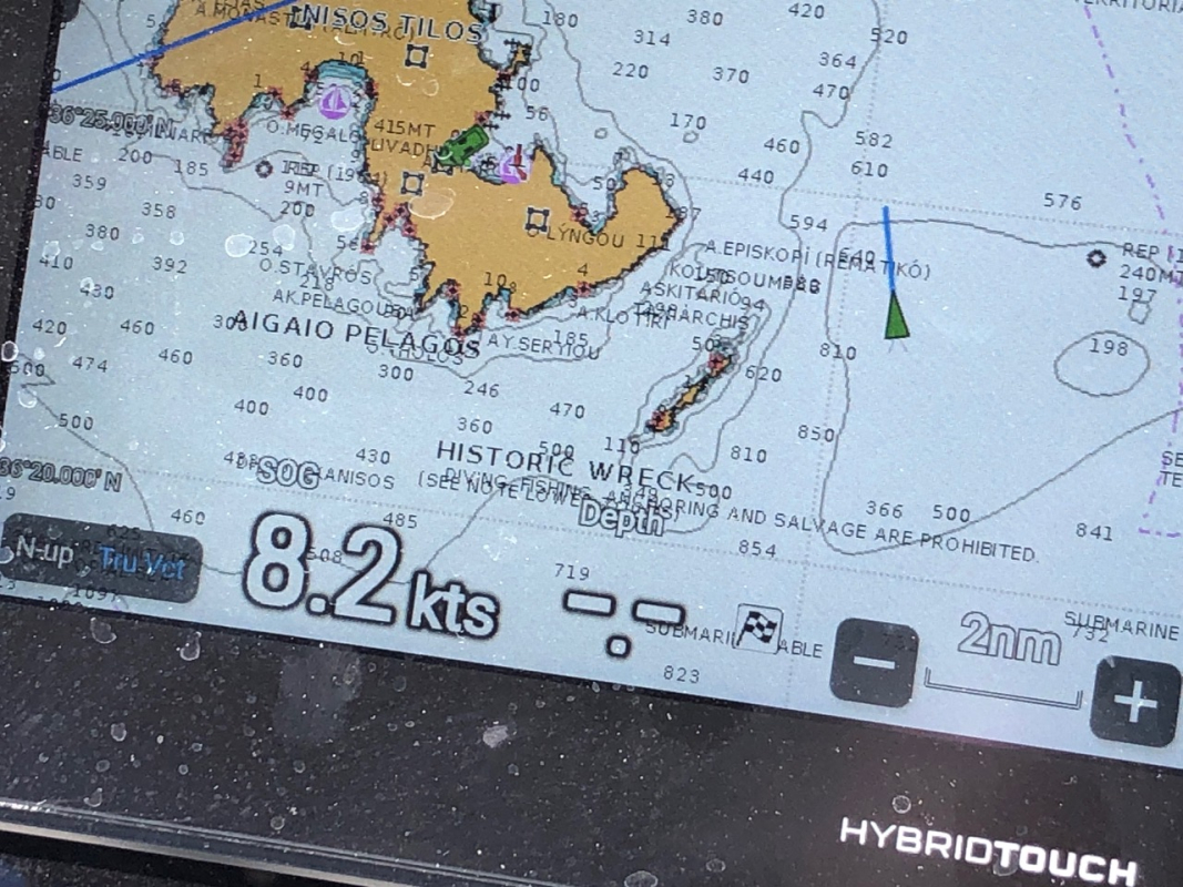 Symiltä purjehdittiin länsilounaaseen kohti Tiloksen saarta aluksi lähes tyynessä mutta nopeasti nousevassa sivutuulessa, joka iltapäivään tultaessa ylsi jo 10-12 m/s nopeuksiin. Etenemisvauhti nousi katamaraanillamme 8-9 solmuun, jolloin merenkäynti jo kasteli hyttejä auki unohtuneiden venttiilien läpi. Olivat satamassa piilotelleet niitä suljettujen verhojen taakse, taas yksi esimerkki veneenrakennuksen tarpeettomaksi muoti-ilmiöksi nousseiden runkoikkunoiden "eduista": makuuhyteissä on oltava verhoja ja satamassa ne on pidettävä kiinni. Merellä ei verhoja tarvita, mutta eipä olla hyteissäkään maisemia katselemassa.